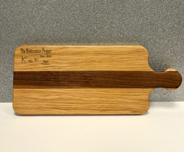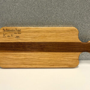 Made from off cuts of other projects including beautiful West African Sapele, this gorgeous chopping board ensures nothing is wasted. With a hand crafted Oak handle