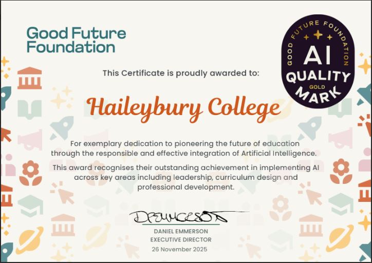 We are delighted to share the wonderful news that Haileybury has been awarded the Gold AI Quality Mark by the Good Future Foundation.